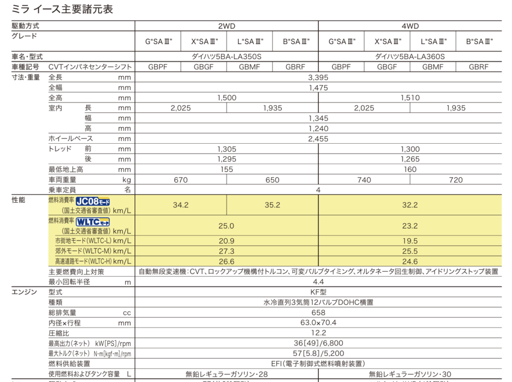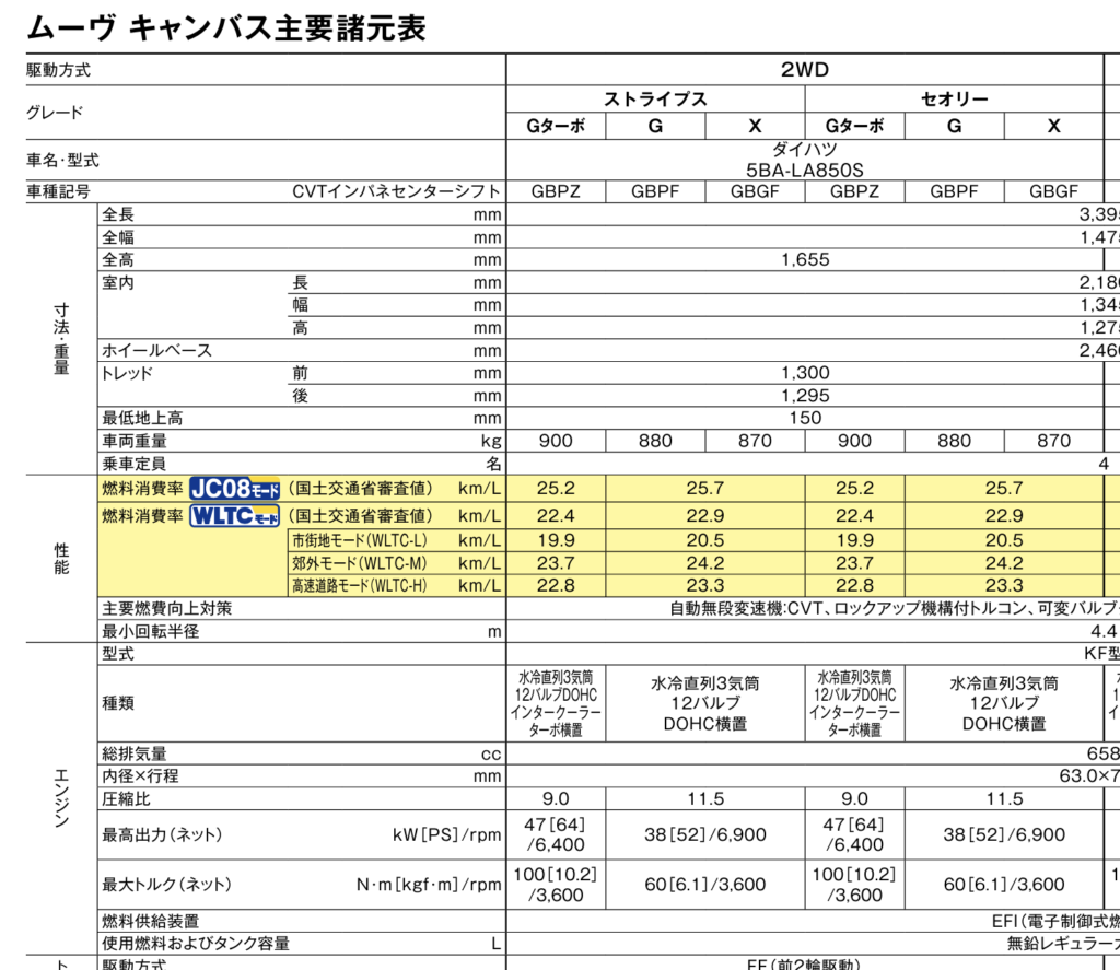 | 車種 | WLTCモード燃費 | WLTCモード高速燃費 |